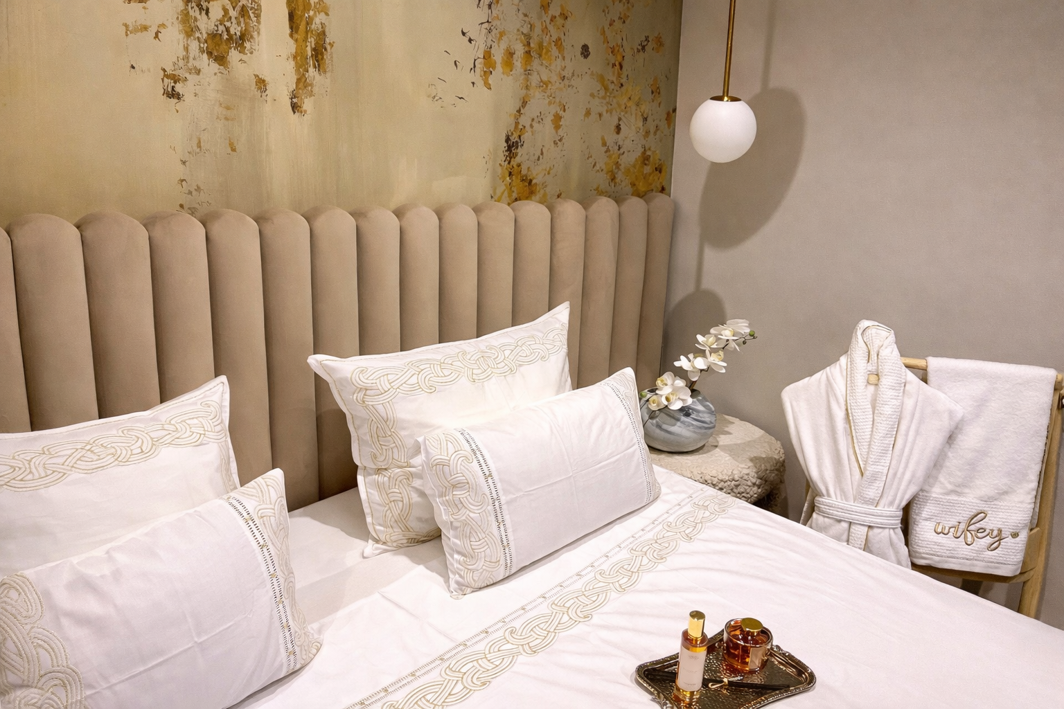 Passant par Des ouvrages de Lit Matchy Matchy Luxueux, aux robes de chambres Haute-Couture, sans épargner le trousseau de baptême ainsi que les accessoires qui font toute la différence by Maison Filyadi.