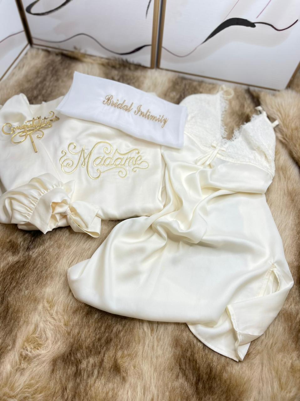 Un Night Wear Haute couture, minitieusement realisé sur de la soie , composé d’une robe de chambre et nuisette ou Top et Short ou encore Top et pantalon avec une touche de dentelle de Calais sur les manches, Nuisette, Pantalon et Top.