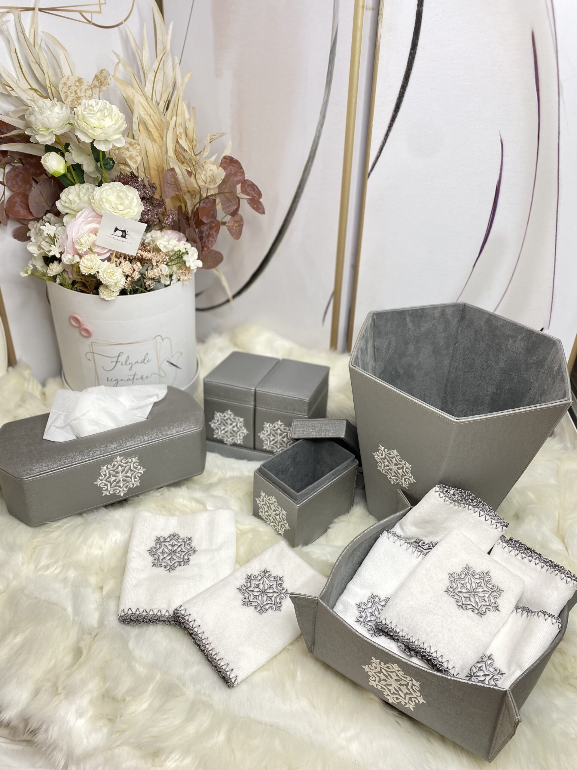 Hemmam, un Coffret pour les salles d’eau de reception en Simili Cuir Customisé selon les couleurs de votre choix brodé ou Personnalisé.