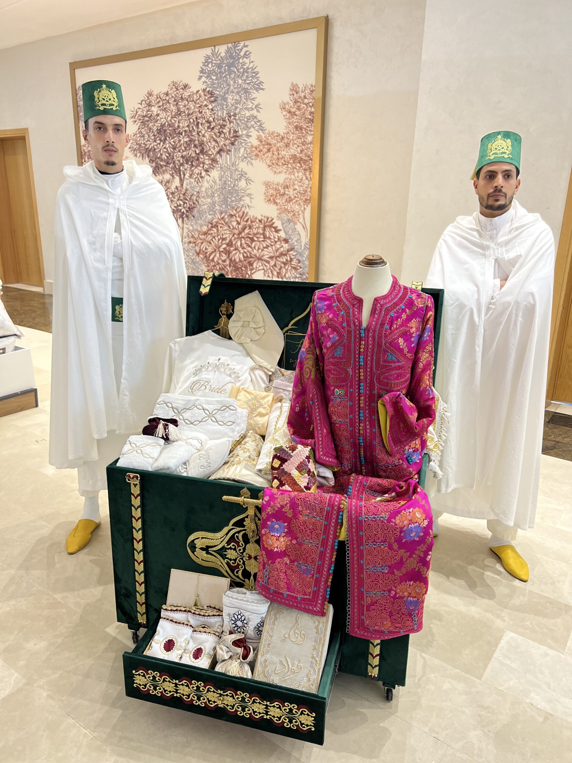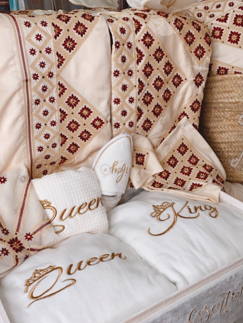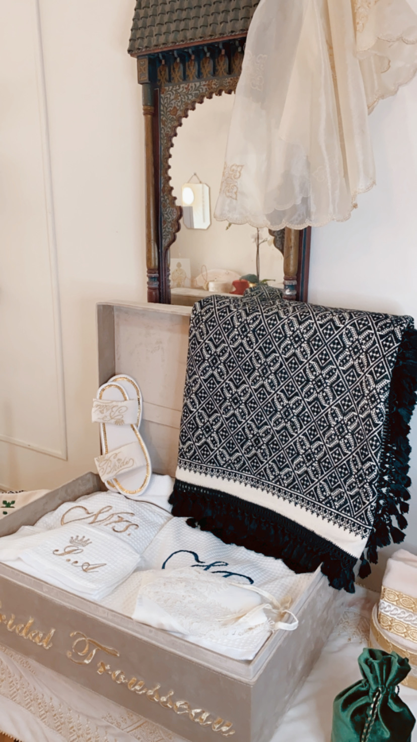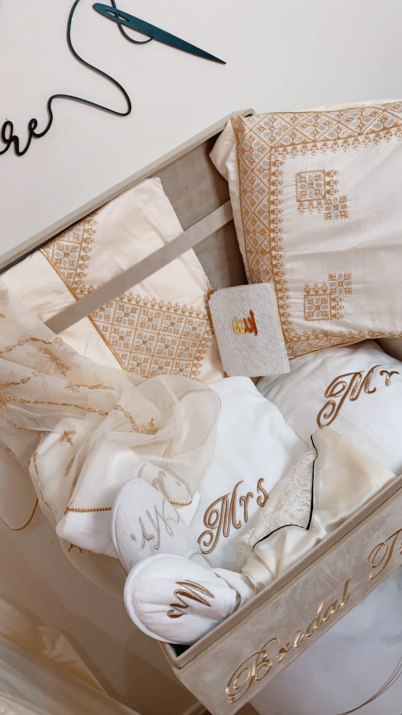 Représente la valise du trousseau de la future Bride. Composé des essentiels de trousseau. Une symphonie de thèmes de Broderies conseillé par Filyadi et choisit par la famille accompagnatrice de la Mariée.