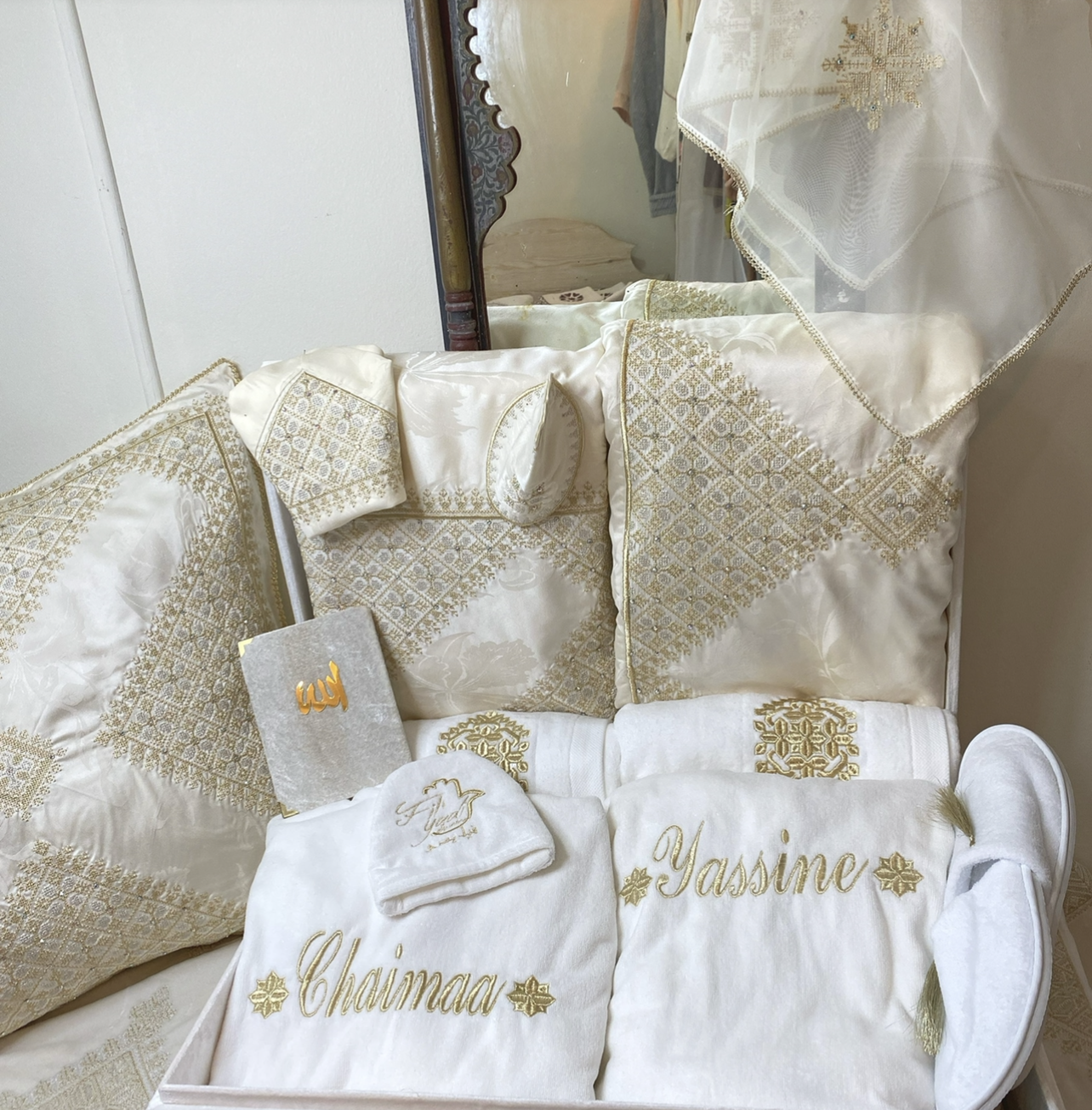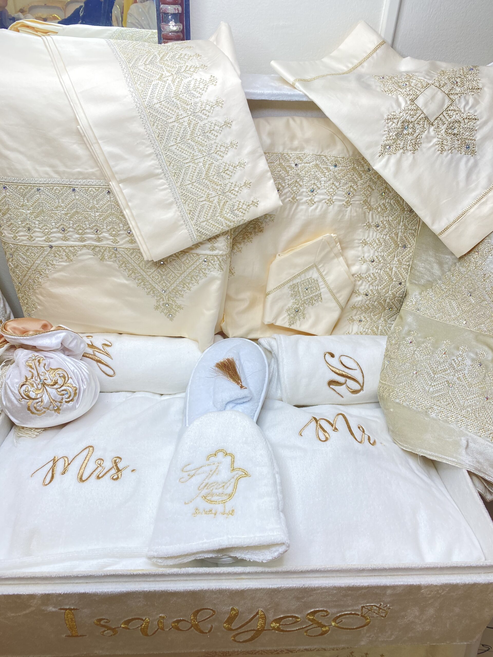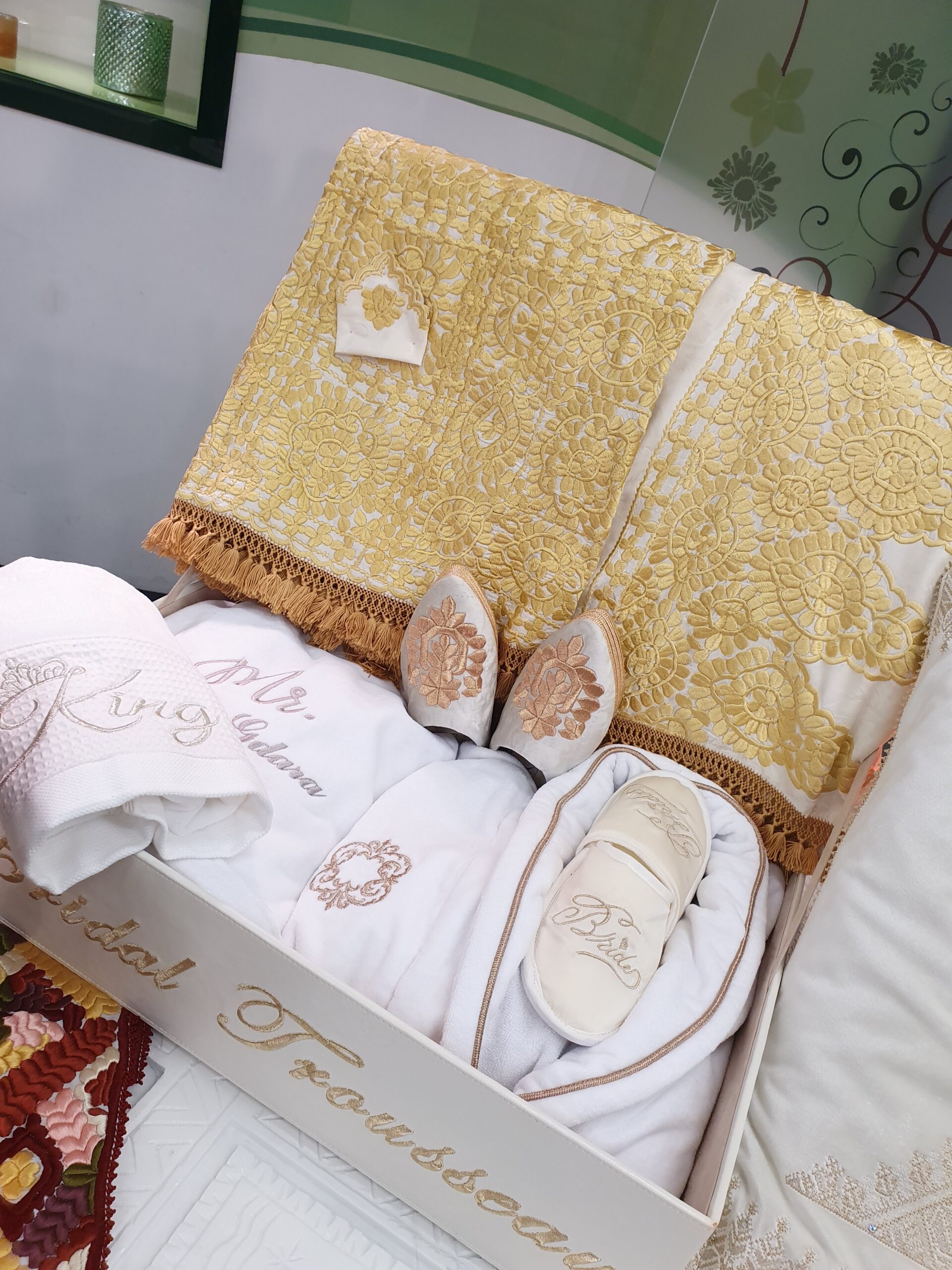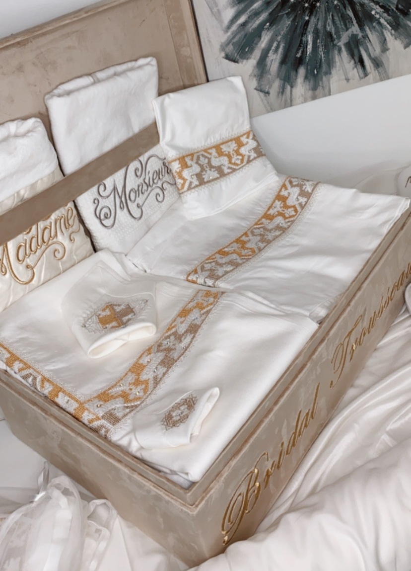 Parure de lit, Ouvrage de table , Ceremonial de thé , Pack de Bain pour Elle & Lui , Coffret Invitation à la prière pour le Couple ,Set de Bridal Intimity en Soie.