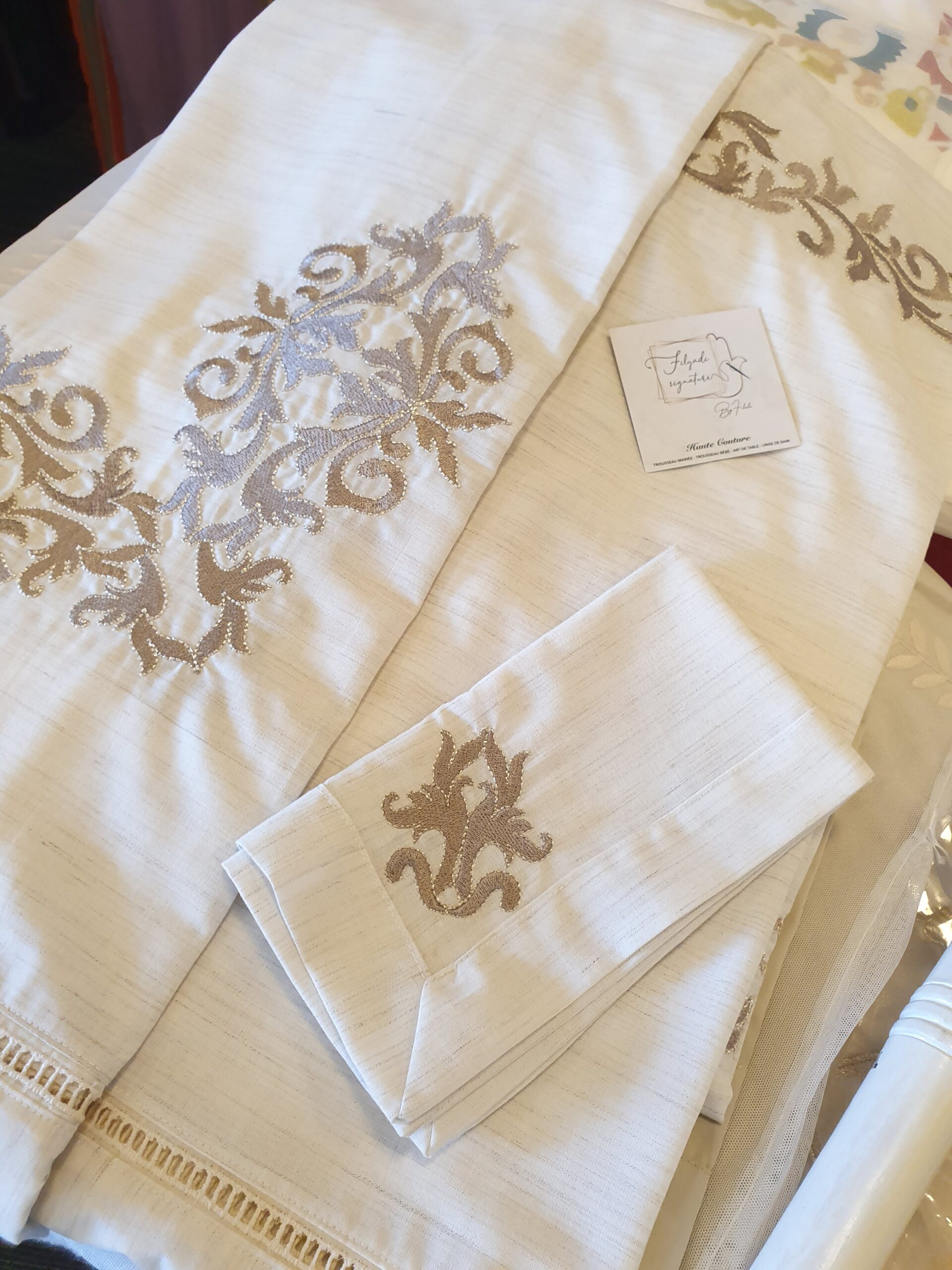 Chic, discret et intemporel travaillé sur du lin avec une bordure en finition point de jours.