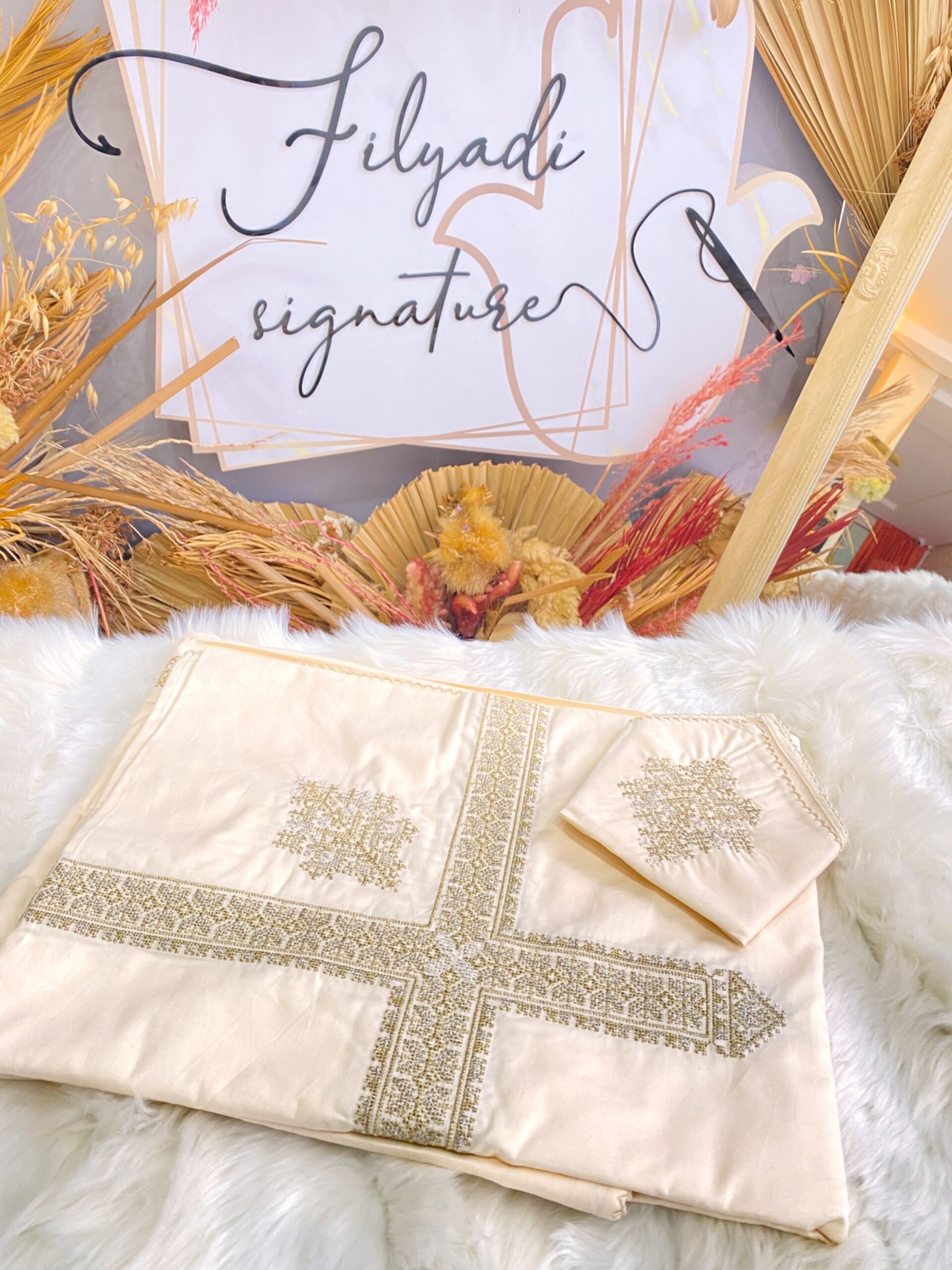 Réalisé en fils d’or & d’argent sur du Coton de Satin.